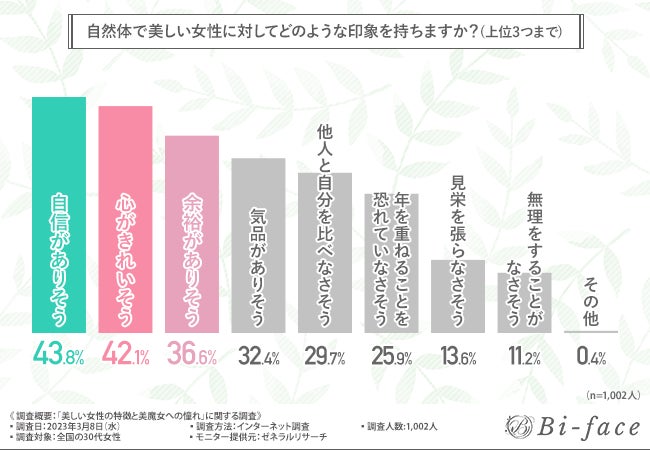 「自然体で美しい女性に対してどのような印象を持ちますか?(上位3つまで)」と質問したところ、『自信がありそう(43.8%)』と回答した方が最も多く、次いで『心がきれいそう(42.1%)』『余裕がありそう(36.6%)』と続きました。