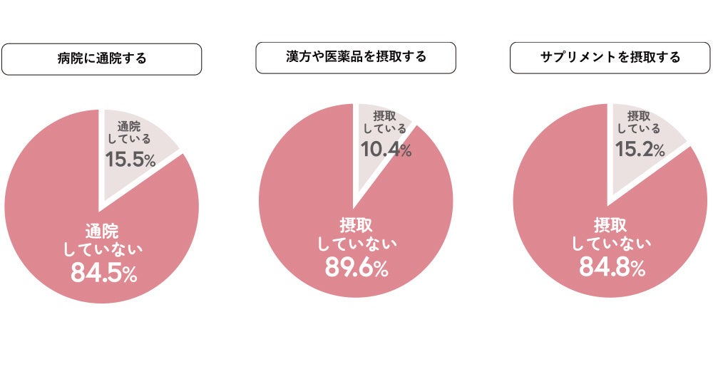 また、全年代で、なるべく薬に頼らずに自然のもので対処したいという意向が高いことが、通院や何らかの対処をしない原因とも考えられます。