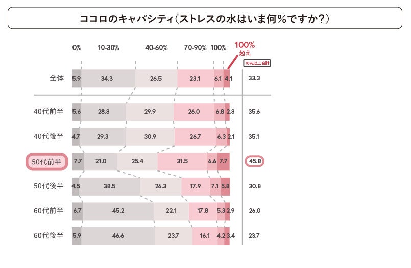 【50代変わりめ期女性の本音を調査】40~50代の女性たちは、ココロのキャパシティ70%以上が3割を超える結果に。不調解決のカギは自分の状態を知ることから。