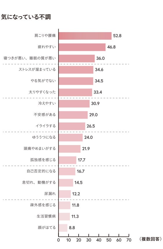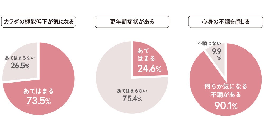 また、カラダの機能低下を気にする人は73.5%とこちらも多くの人が気にしているものの、心身の不調があると答えた人は+16.6ポイントと大きく上回る結果に。変わりめ期の女性はカラダの不調を感じるだけでなくココロの部分の不調感を併せ持つことが明確となっています。