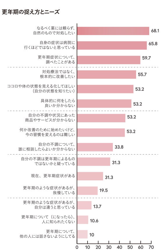 具体的な不調は、更年期症状と言われる内容も多く、自身の不調が女性ホルモンのバランスによるものだとの自覚がない又は更年期症状と認めたくないという意識が垣間みられる結果になりました。