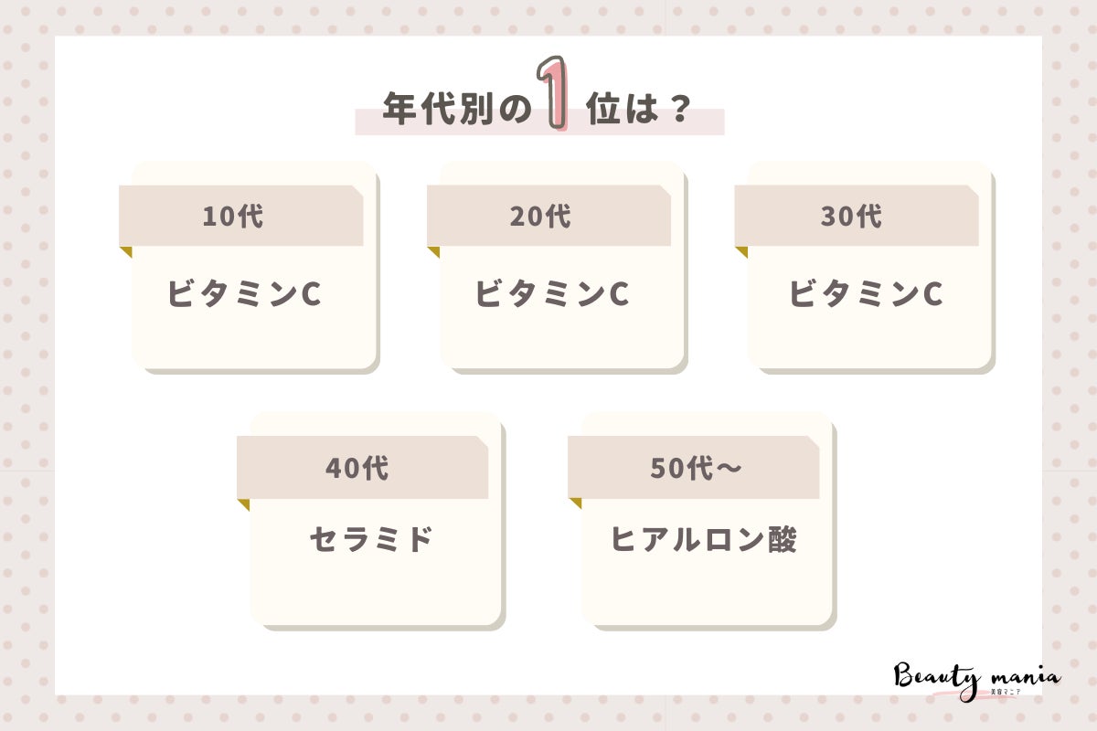 「スキンケア化粧品を選ぶ時に入っているとうれしい成分はなんですか?」とアンケート調査した結果、1位は『ヒアルロン酸(59人)』、2位は『ビタミンC(53人)』、3位は『セラミド(36人)』となっています。